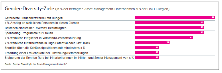 Zudem hat nur jedes fünfte befragte Unternehmen eine feste Quote für weibliche Führungskräfte im Vorstand oder auf den unmittelbaren Führungsebenen. Stattdessen bevorzugen viele Arbeitgeber im Asset Management qualitative Maßnahmen, um die Gender Diversity auszubauen. So haben 60 Prozent der Unternehmen eine Antibelästigungsrichtlinie eingeführt. 53 Prozent haben Maßnahmen ergriffen, um die geschlechterspezifische Lohnlücke zu schließen.