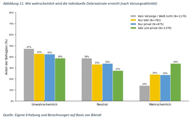 Ein zentrales Ergebnis der Untersuchung ist die deutliche Diskrepanz zwischen gewünschtem und minimal akzeptiertem Versorgungsniveau. Während die Zielersatzrate im Schnitt bei rund 78 Prozent liegt, sehen die Befragten ein Mindestniveau bereits bei etwa 54 bis 58 Prozent als ausreichend an. Diese Differenz von rund 20 Prozentpunkten beschreibt eine erhebliche Versorgungslücke. Sie zeigt, dass viele Haushalte zwar nicht von Altersarmut bedroht sein müssen, ihren gewohnten Lebensstandard im Alter jedoch nicht halten können.